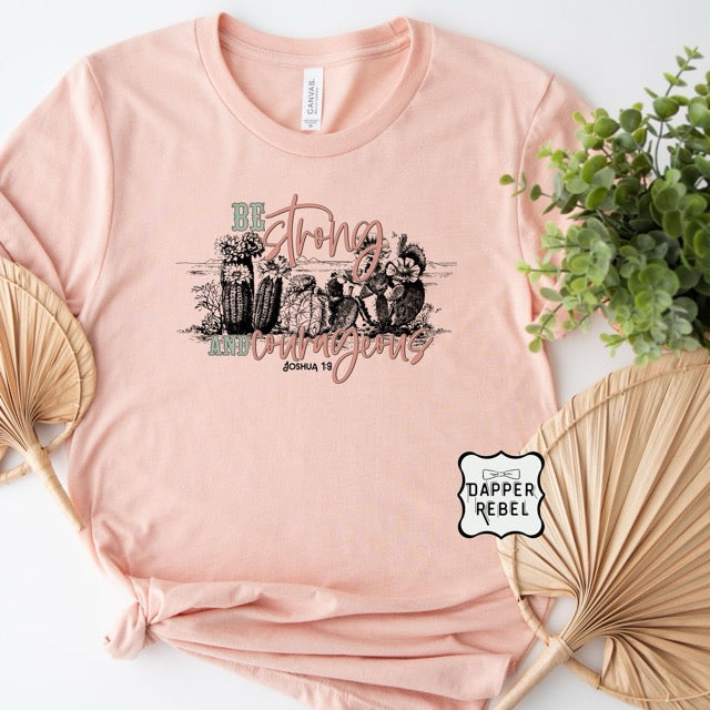 This lovely t-shirt features the empowering message "Be Strong and Courageous" from Joshua 1:9, beautifully illustrated with a detailed graphic of cacti and wildflowers. The design merges natural imagery with a spiritual reminder, making it an inspiring choice for those who draw strength from their faith. The soft pink hue adds a gentle, comforting touch, enhancing the shirt's uplifting message.