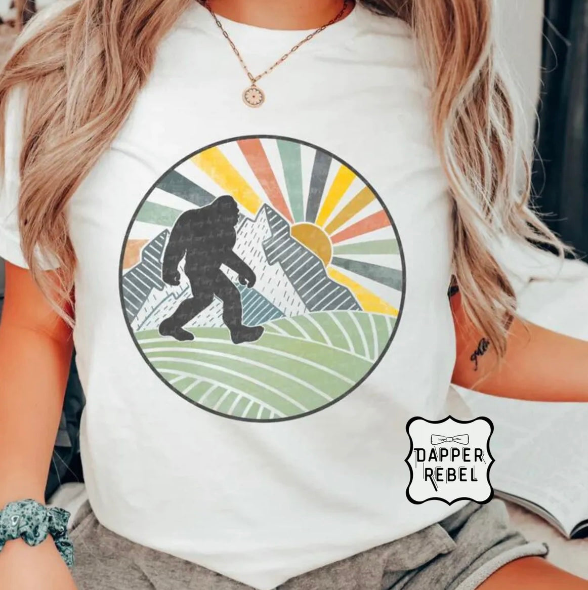 Step out in style with this captivating t-shirt that's sure to be a conversation starter! The iconic silhouette of Bigfoot takes center stage, set against a backdrop of stylized sun-rays and mountain scenery, evoking the mystery and adventure of the great outdoors. The design's retro vibe is enhanced by a vibrant color palette, making it a perfect match for those who love to blend urban legends with a touch of vintage flair.