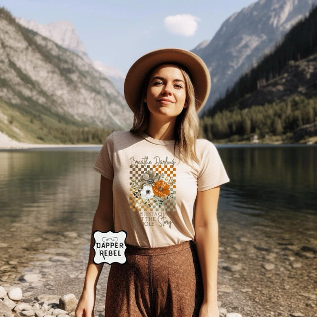 Take a deep breath and wear your reminder with pride in our Breathe Darling Tee. Featuring a beautiful floral design over a warm-toned checkerboard background, this tee carries the message “Breathe Darling — it’s just a chapter, not the whole story,” reminding you to slow down and trust the process.