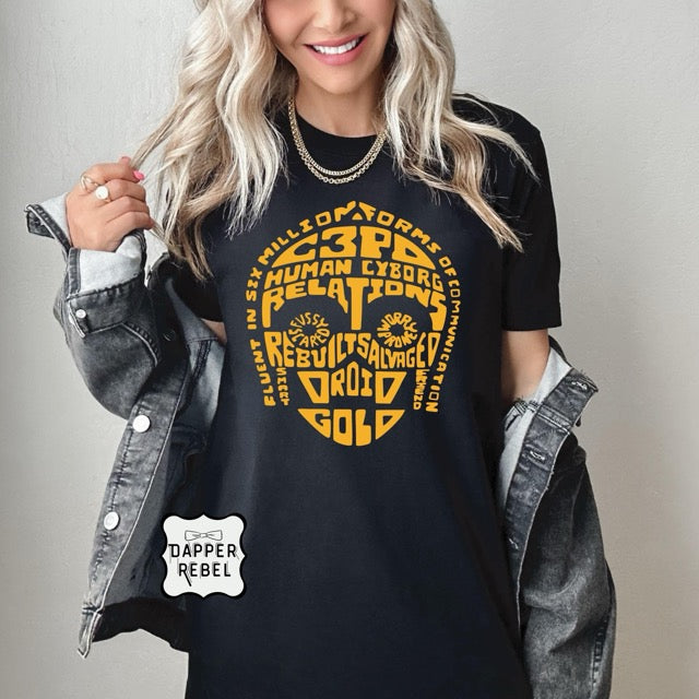 Show your love for one of Star Wars' most iconic characters with this creative "C-3PO" t-shirt! This stylish black tee features a unique design with a silhouette of C-3PO created using words associated with him like "Human Cyborg Relations," "Fluent in over six million forms of communication," and "Droid Gold."