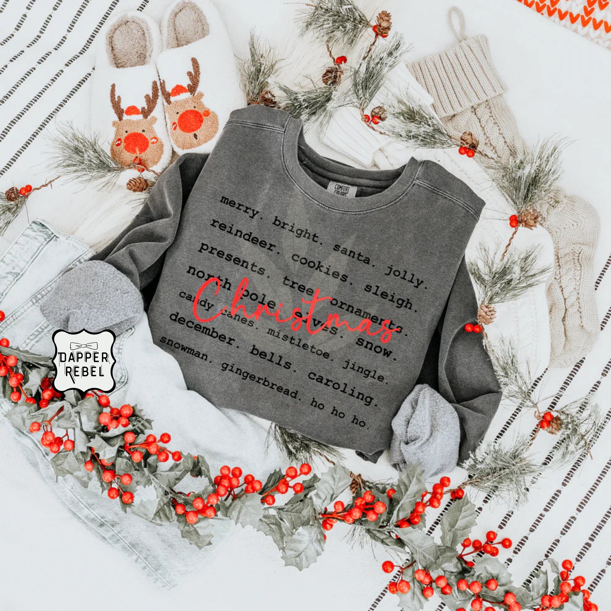 Get into the holiday spirit with our Christmas Words sweatshirt! Featuring festive phrases and classic Christmas imagery, this cozy sweatshirt is perfect for spreading cheer all season long.