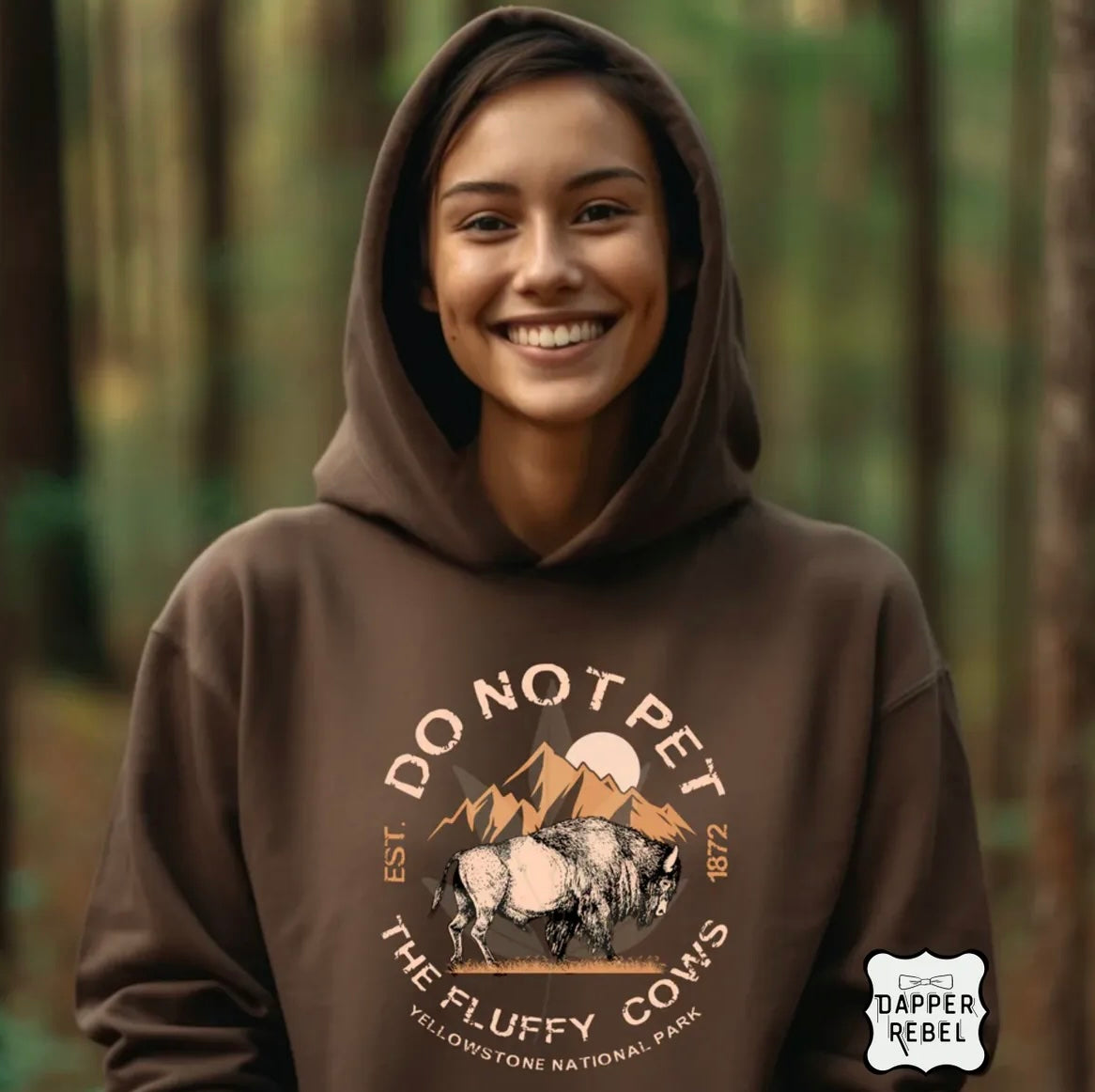 Make a statement with this Do Not Pet the Fluffy Cows hoodie, inspired by the wild beauty (and very real warnings) of Yellowstone National Park. Featuring a rugged mountain backdrop and iconic bison graphic, this design blends humor with an appreciation for nature and wildlife.
