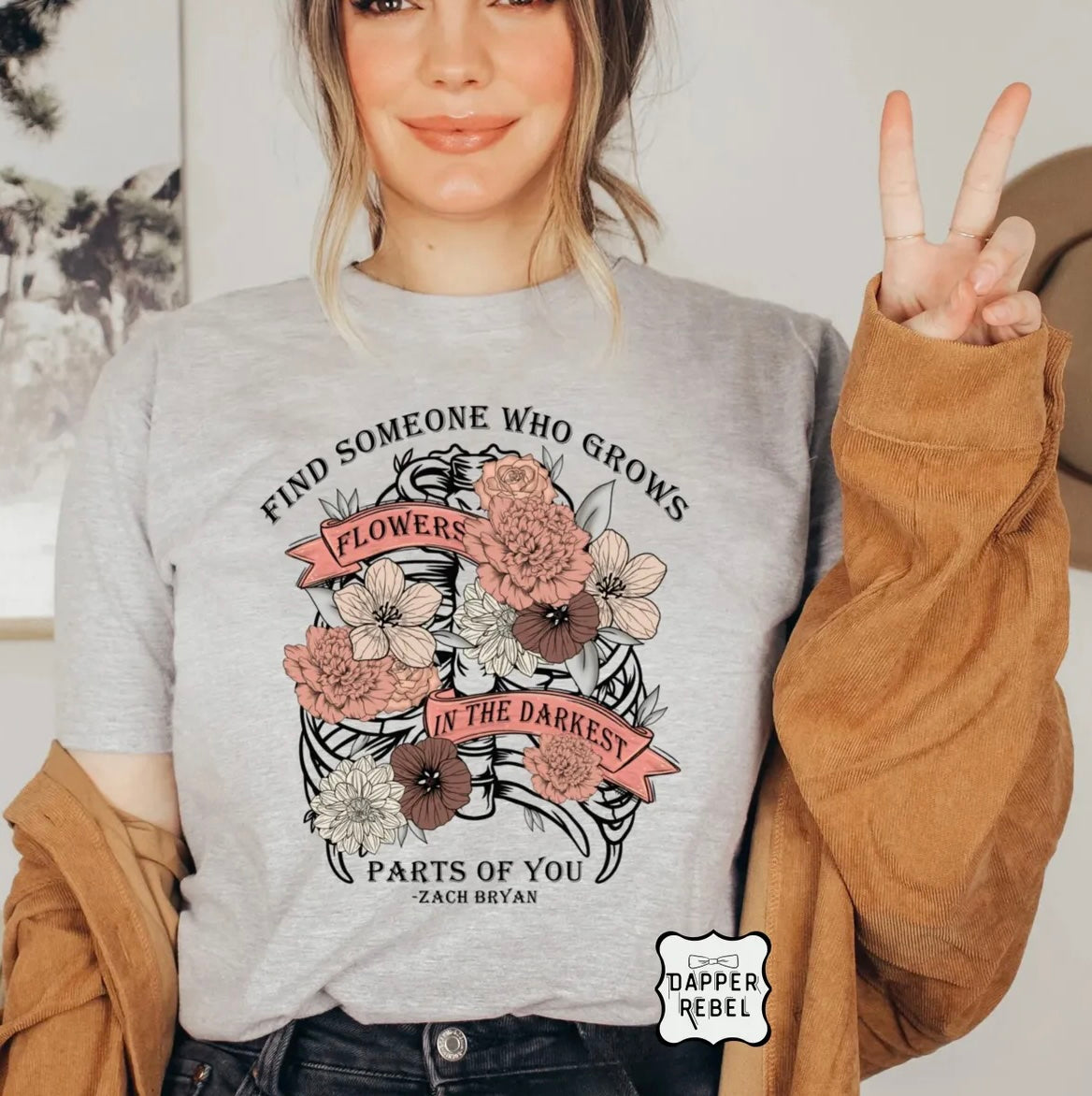 Spread positivity and inspiration with this beautiful ‘Find Someone Who Grows Flowers in the Darkest Parts of You’ tee, featuring heartfelt lyrics by Zach Bryan. Adorned with a stunning floral design, this shirt is perfect for anyone who values growth, resilience, and love. Whether you’re out and about or enjoying a cozy day, this soft and stylish tee is sure to brighten your day and those around you. Grab yours now and let the flowers bloom!