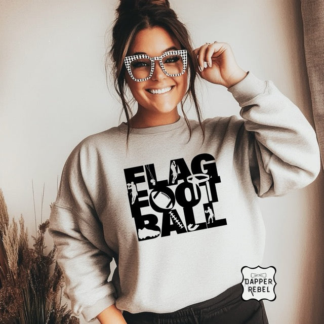 Show your love for the game with this cozy Flag Football Sweatshirt! Featuring a bold block-letter design filled with sporty silhouettes and football graphics, this crewneck is perfect for players, fans, and sideline supporters alike.
