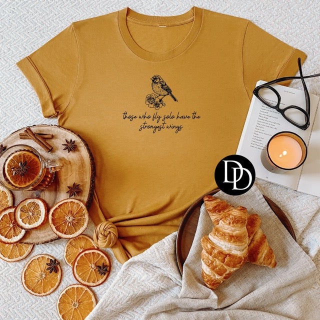 This t-shirt exudes a blend of inspiration and charm, perfect for anyone who appreciates the beauty of independence. Embellished with the poetic phrase, "Those who fly solo have the strongest wings," accompanied by a delicate bird illustration, it's a tribute to self-reliance and personal strength. The warm, mustard hue adds a cozy feel, making it a versatile addition to any wardrobe.