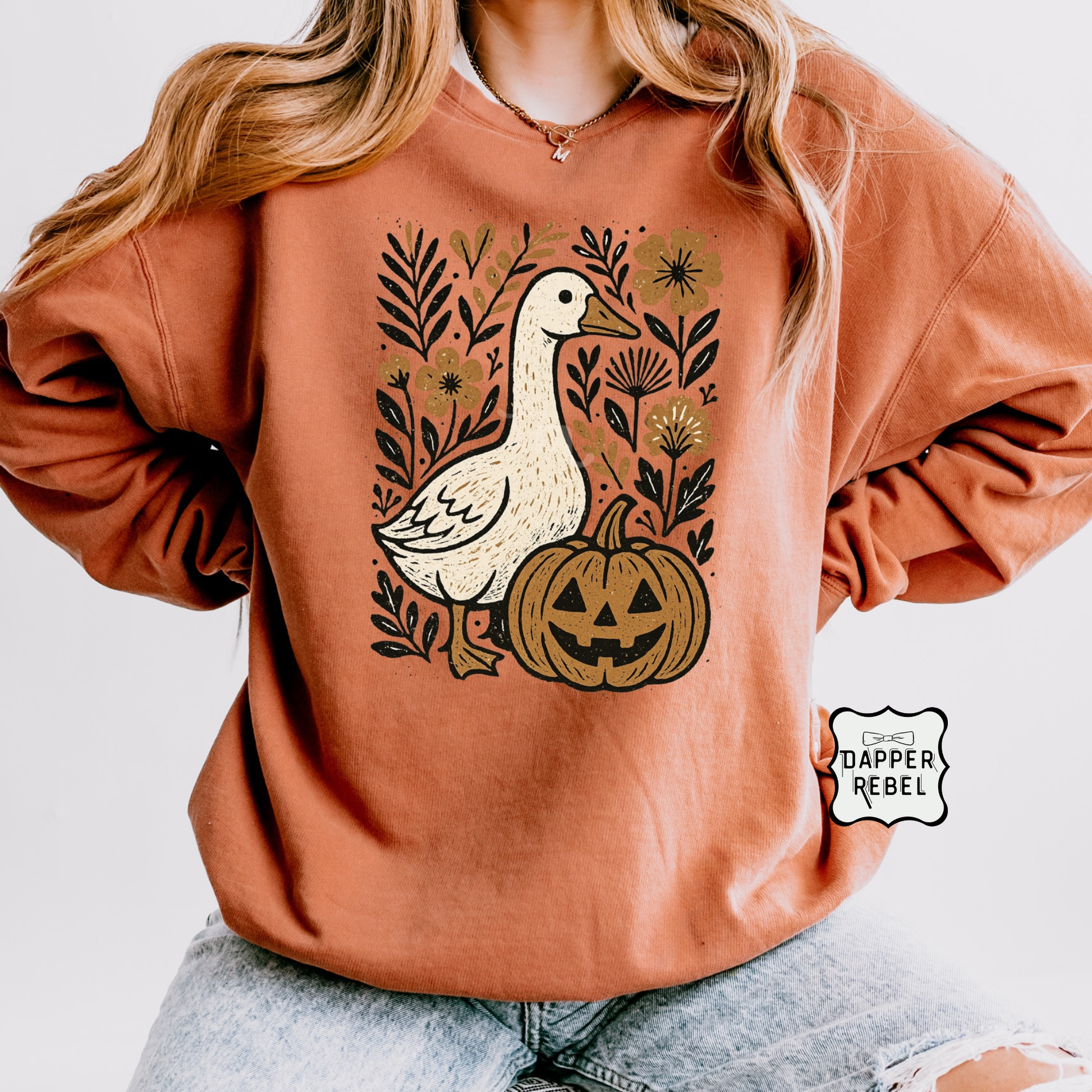 This warm, autumn-inspired sweatshirt features an adorable goose paired with a playful pumpkin and floral accents for the perfect seasonal look. Set on a rich, earthy background, the charming illustration brings a fun and festive fall vibe to any outfit. Soft, comfortable, and easy to layer, this sweatshirt is ideal for pumpkin patch visits, crisp fall days, or cozy nights in. A must-have piece for welcoming the season in style.
