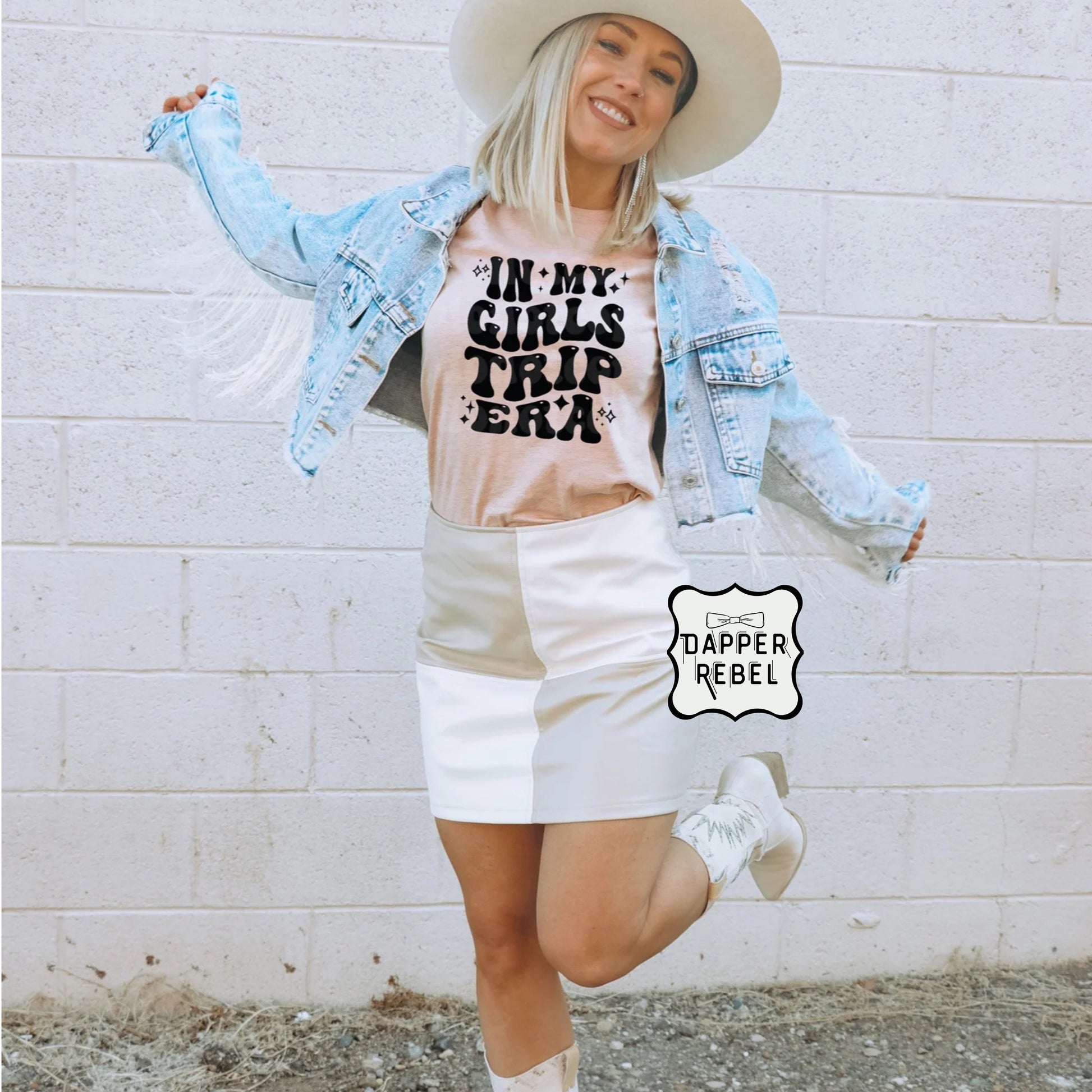 Step into your girls trip era with this fun and stylish t-shirt! Perfect for a weekend getaway with your besties, this tee is a must-have for your wardrobe.
