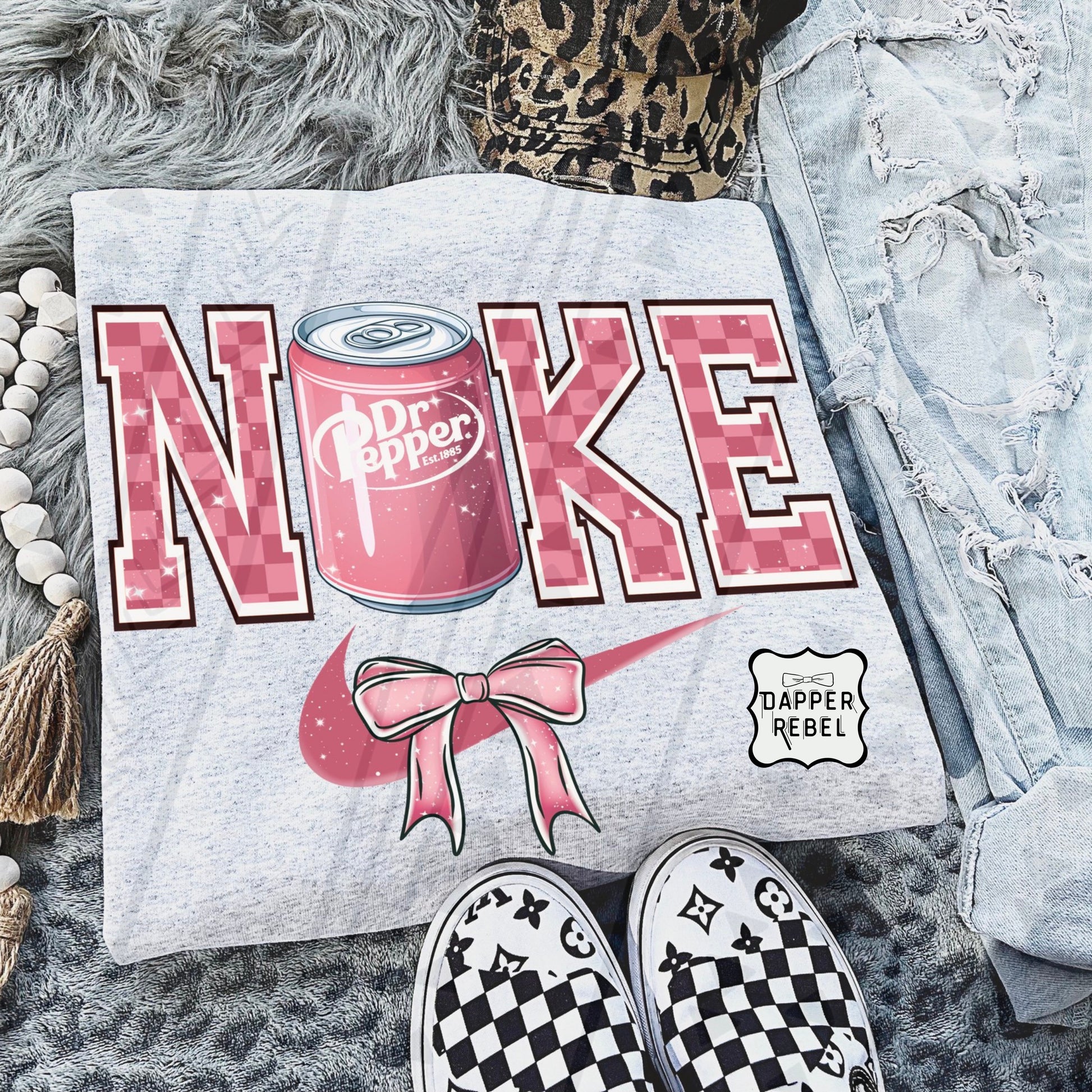 Two icons, one shirt — but with a twist! This tee playfully blends Dr Pepper + Nike with a bold pink design, featuring a soda can, swoosh, and bow for that perfect mix of sporty and sassy. Whether you’re a Dr Pepper addict, a sneakerhead, or just love cheeky statement shirts, this one’s for you.