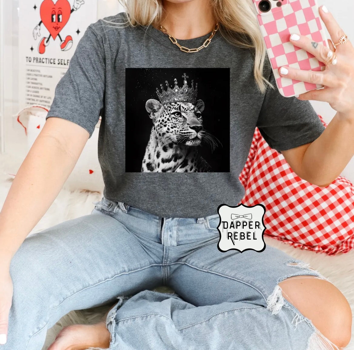 Introducing the Queen Cheetah t-shirt, perfect for those days when you're feeling fierce and fabulous! Made for the fashion-forward individual who isn't afraid to show off their wild side. Pair it with your favorite jeans for a look that screams "I'm the queen of the jungle...or at least my own backyard!"