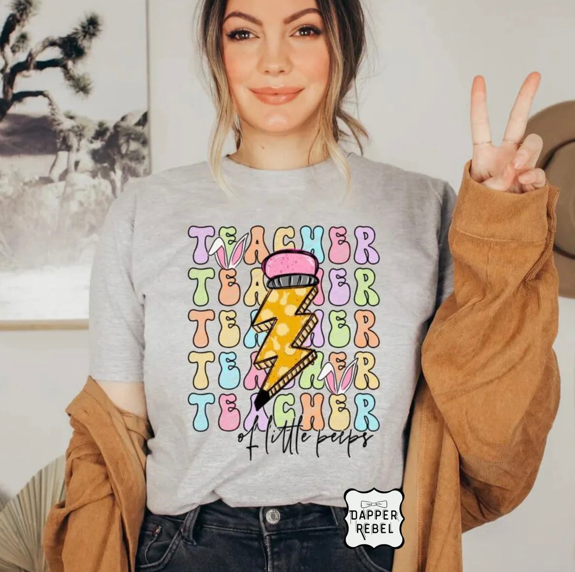 Brighten up your classroom style with this adorable ‘Teacher of Little Peeps’ tee! Featuring vibrant colors, a fun lightning bolt pencil design, and playful lettering, this shirt is perfect for teachers who inspire young learners with energy and creativity.