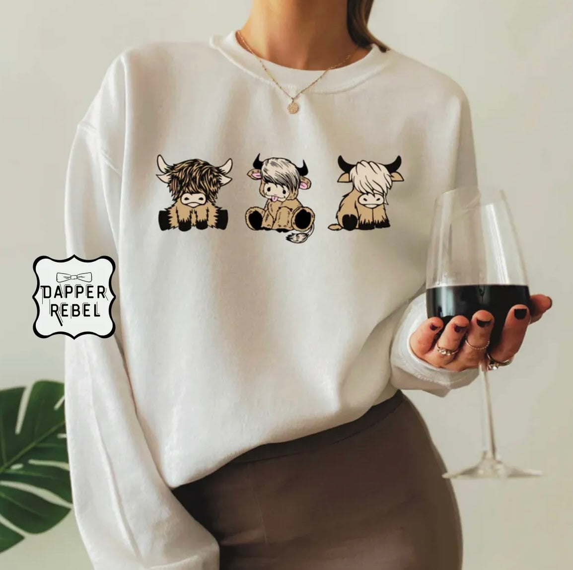 This whimsical white sweatshirt features adorable illustrations of Highland cows in various poses, each with its own unique charm. The playful designs, rendered in simple black outlines with subtle touches of color, make this sweatshirt a standout piece. It's perfect for those who appreciate quirky, cute graphics and enjoy a touch of humor in their wardrobe.